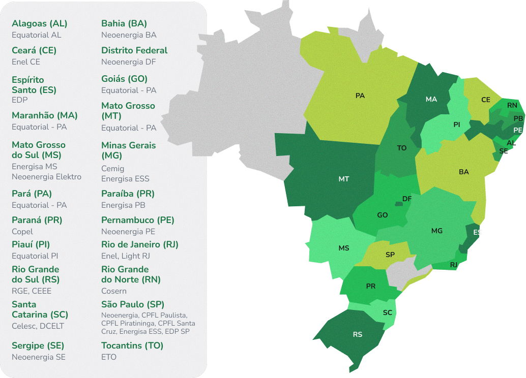 Atendemos mais de 20 estados por meio da Geração Distribuída. Uma presença que cobre mais de 50% do território nacional.